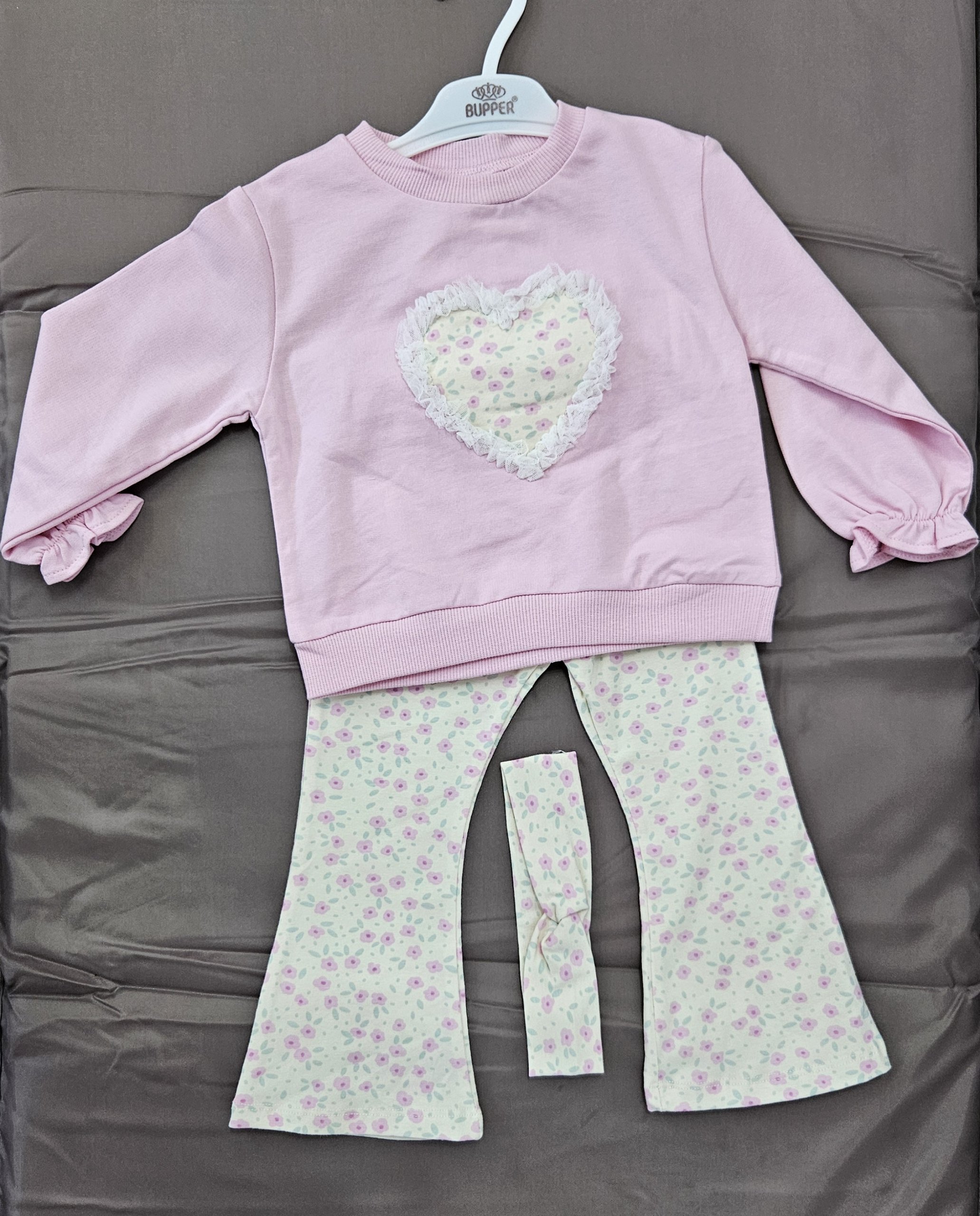 COMPLEU ESTE ALCATUIT DIN BLUZA ROZ CU MODEL INIMIOARA, PANTALON COLANT ALB CU MODEL FLORICELE SI O BANDEROLA.