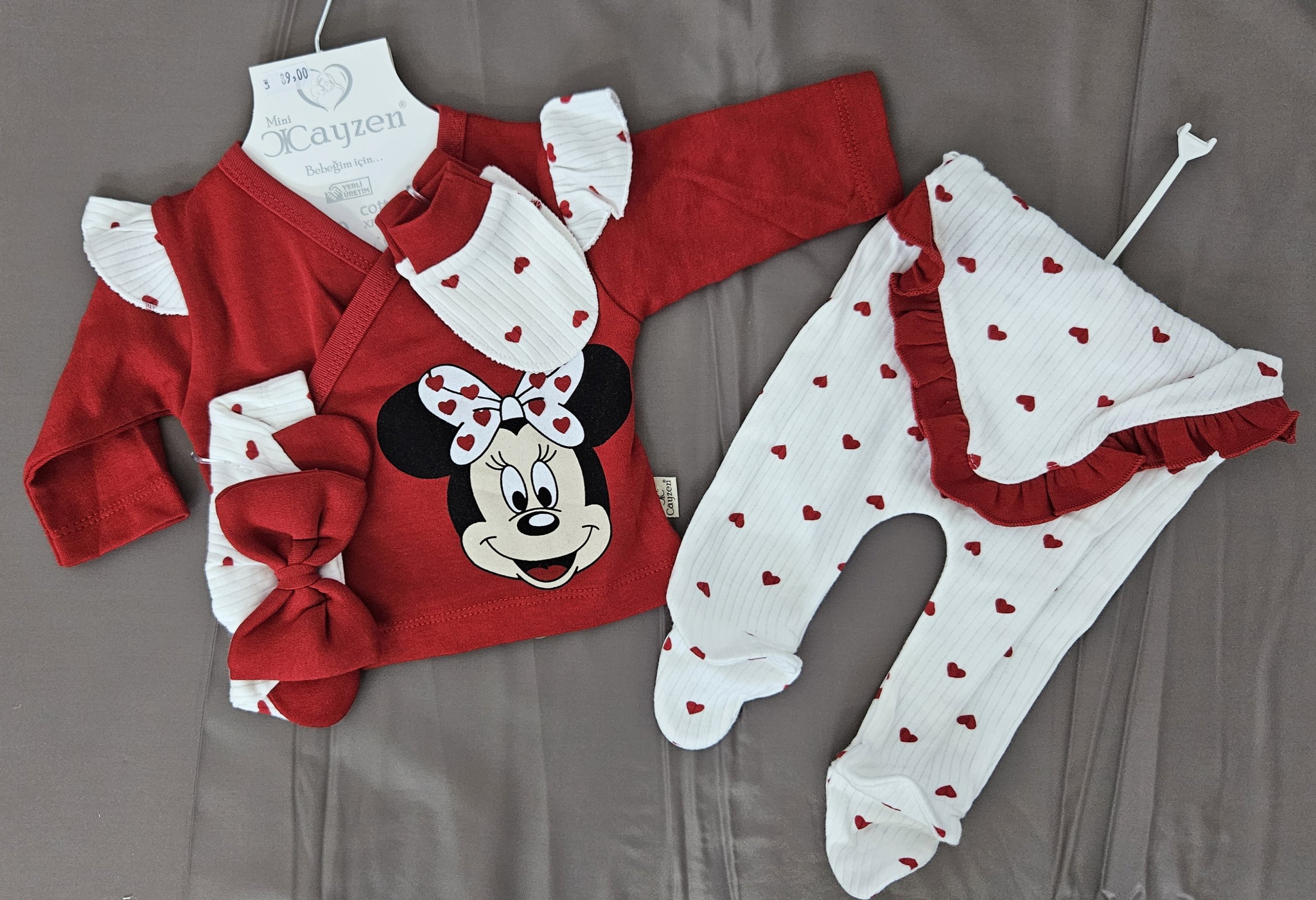Acest set adorabil pentru nou-născuți este confecționat integral din bumbac natural, oferind confort și protecție pielii delicate a bebelușului. Bluza roșie cu imprimeu vesel și volănașe laterale se asortează perfect cu pantalonii albi cu inimioare roșii și volănaș decorativ, iar botoșeii incluși completează ținuta. Este un set practic, comod și plin de farmec, potrivit atât pentru acasă, cât și pentru primele plimbări.